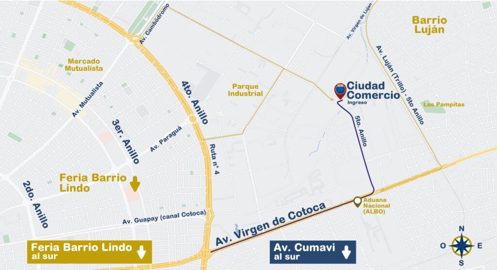 Av. Virgen de Cotoca y 5° Anillo Ingresando 500 m por la Av. con semáforo frente a la Aduana Nacional (ALBO)