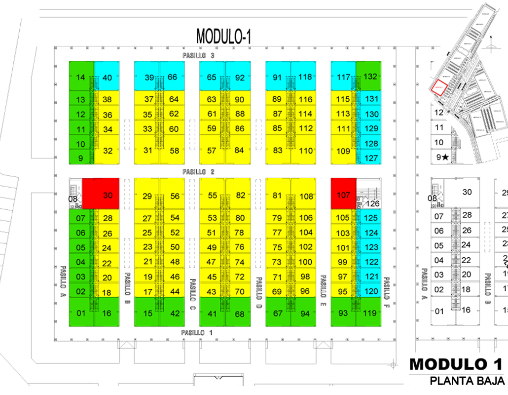 Los baños públicos en este modulo se encuentran al lado de los locales de color rojo, pasillo central.