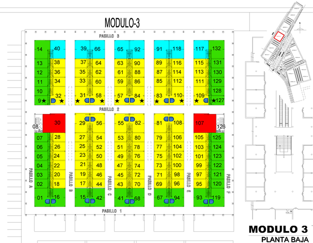 Los baños públicos en este modulo se encuentran al lado de los locales de color rojo, pasillo central.